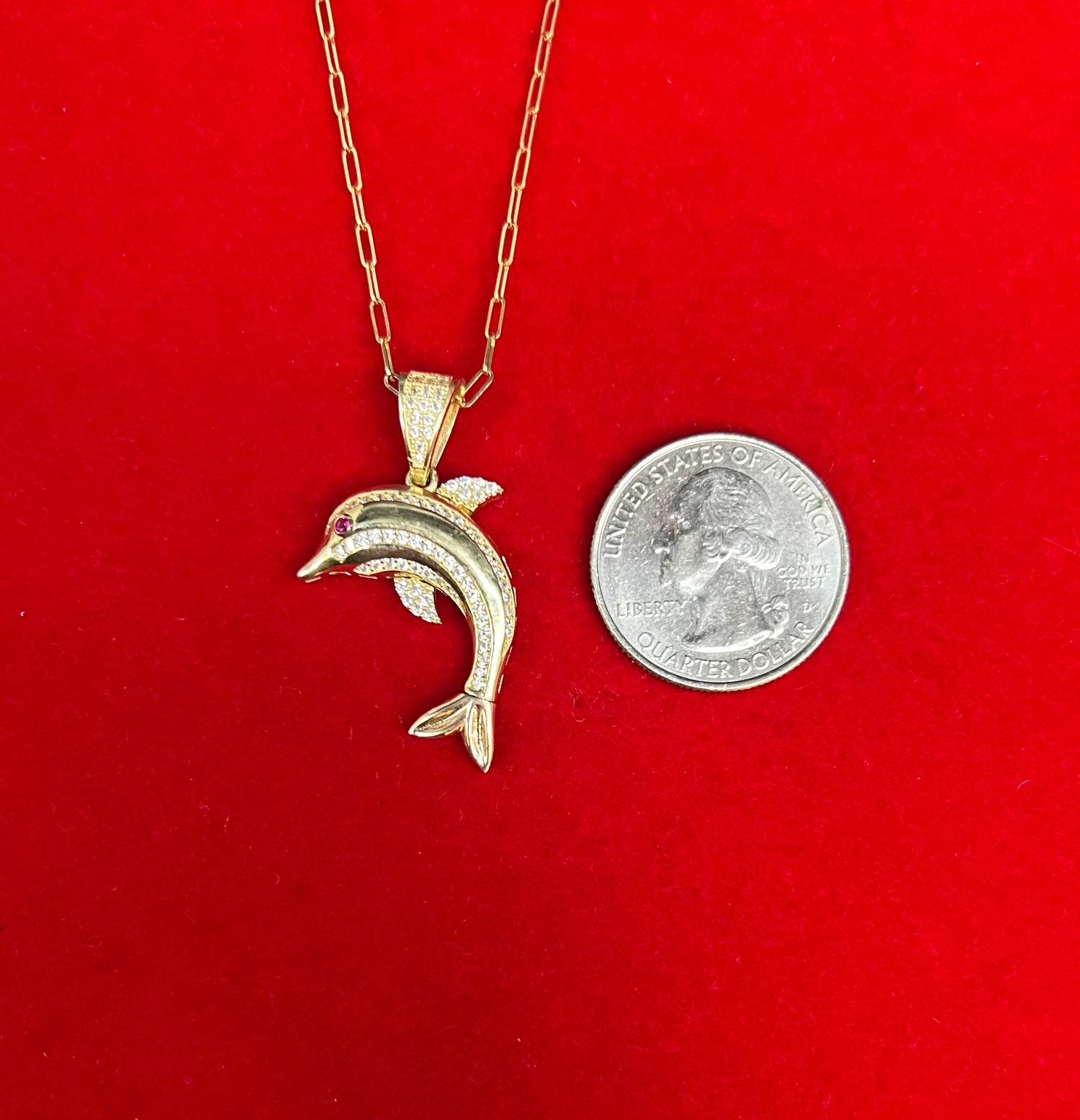 14k Real Gold Dolphin Pendants Necklace, with 14k Solid Gold 1.5mm Paperclips Chain Necklace , Dolphin Charm, 14k Solid Gold Dolphin Charm