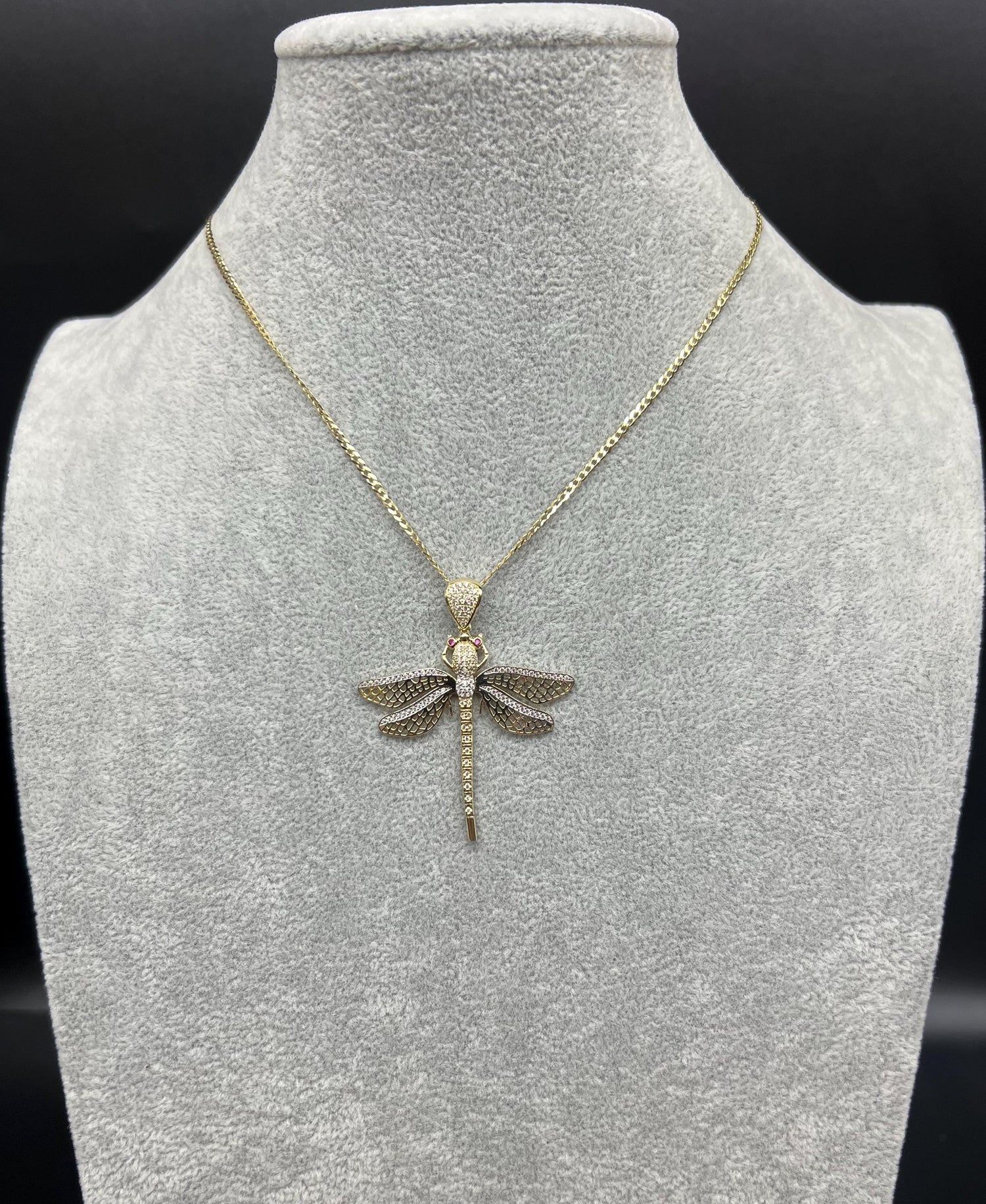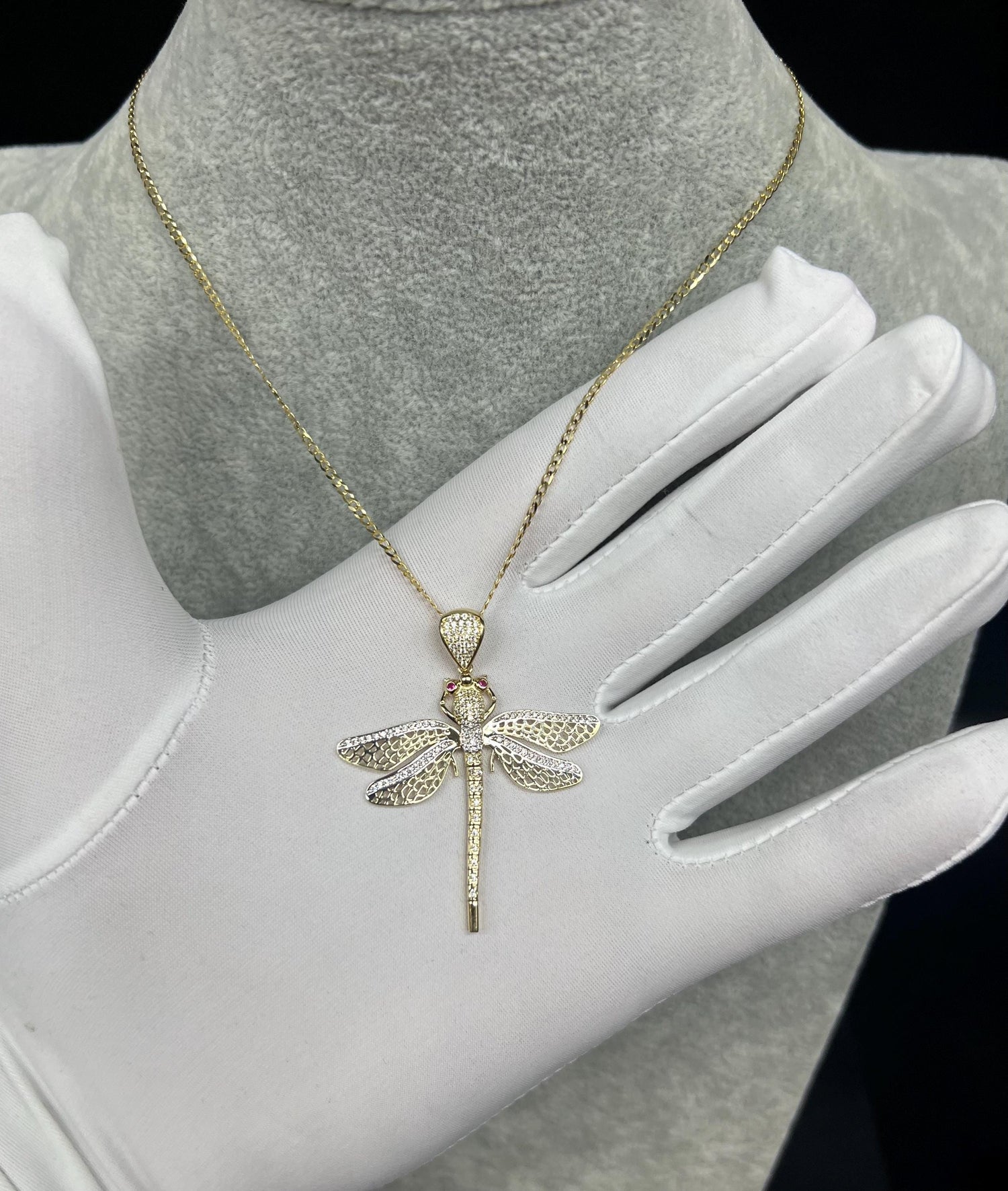 14k Real Gold Dragonfly Pendants Necklace, with 2mm SOLID Cuban Curb Chain , Dragonfly Charm, Firefly charm, Gift, 14k Gold Charm