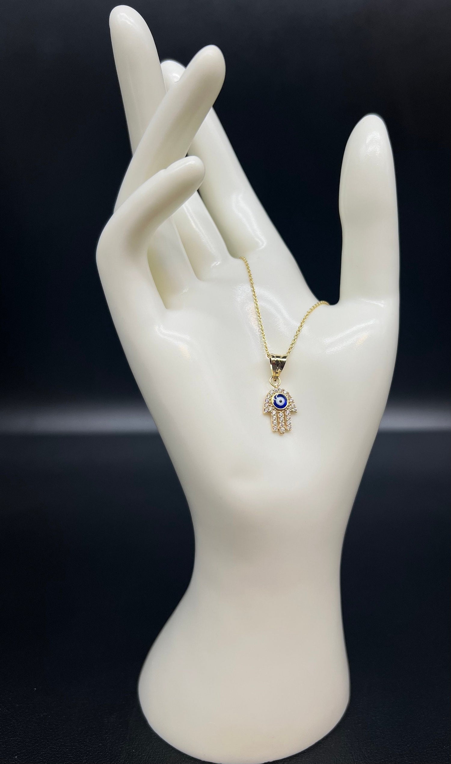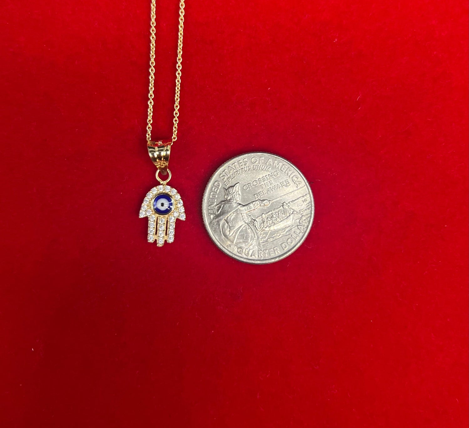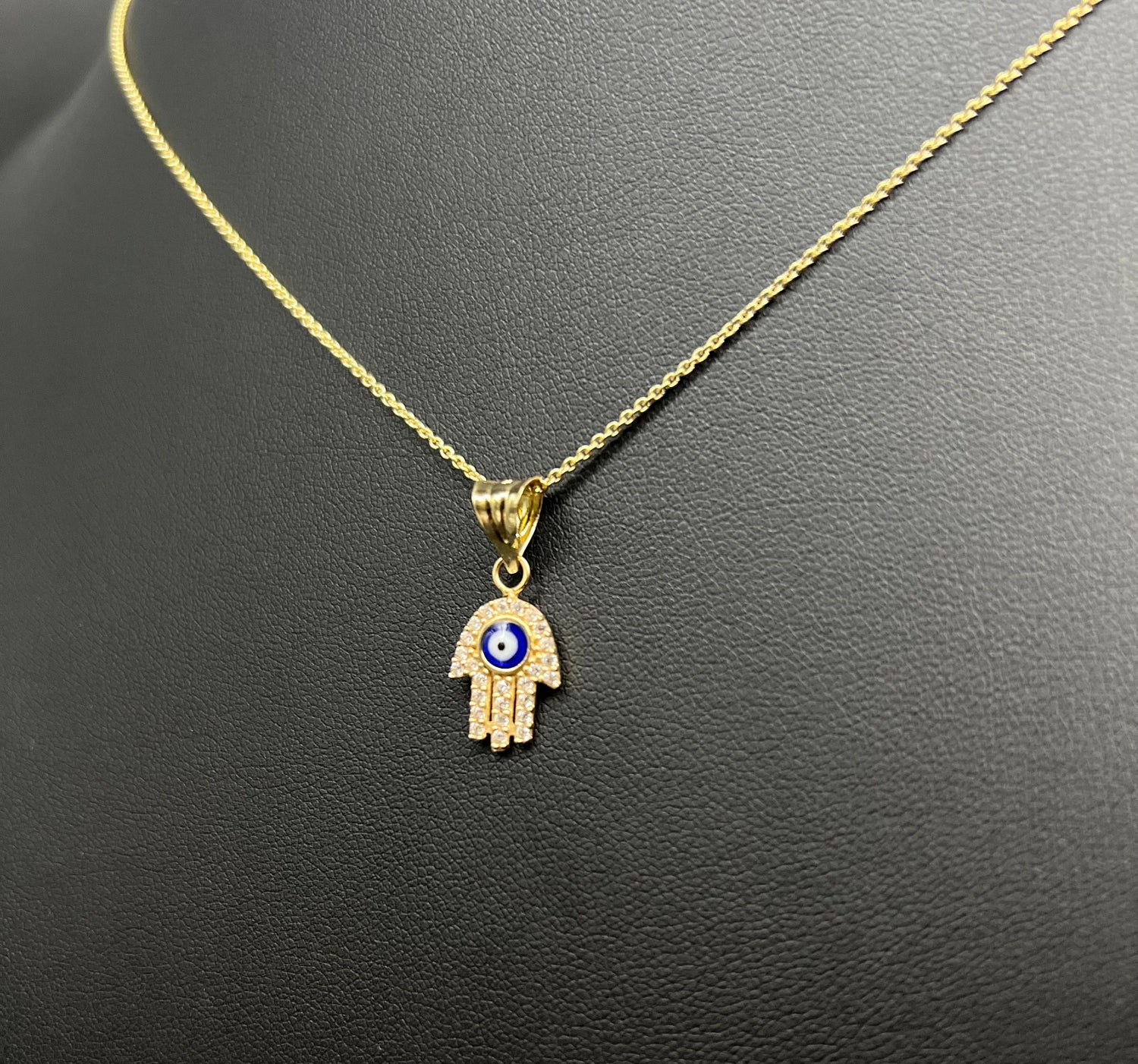 14k Real Gold Evil Eye Pendants Necklace, with 14k Solid Gold 1mm Cable Chain, Evil Eye Hamsa Hand Charm,Fatima Hand Pendant, Evil Eyes